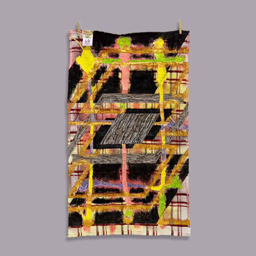 Better Homes #1. 2022. Pintura al agua (acrílico, látex y espesante) sobre paño de cocina, 26.5” x 16’’; pinzas para tender ropa recubiertas de escarcha metálica.