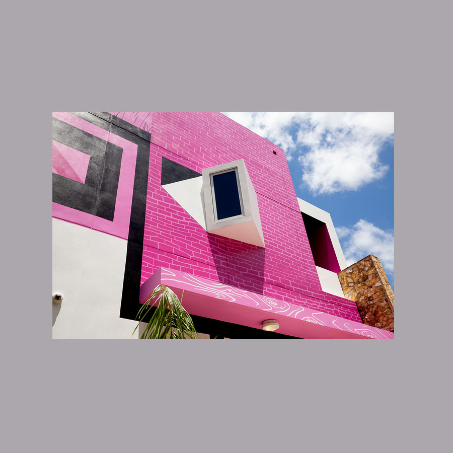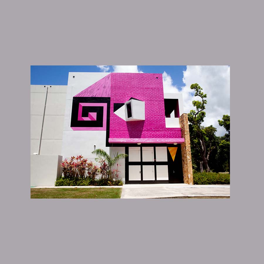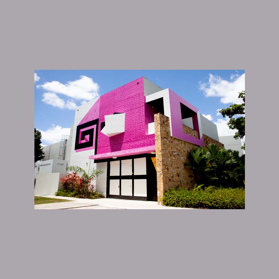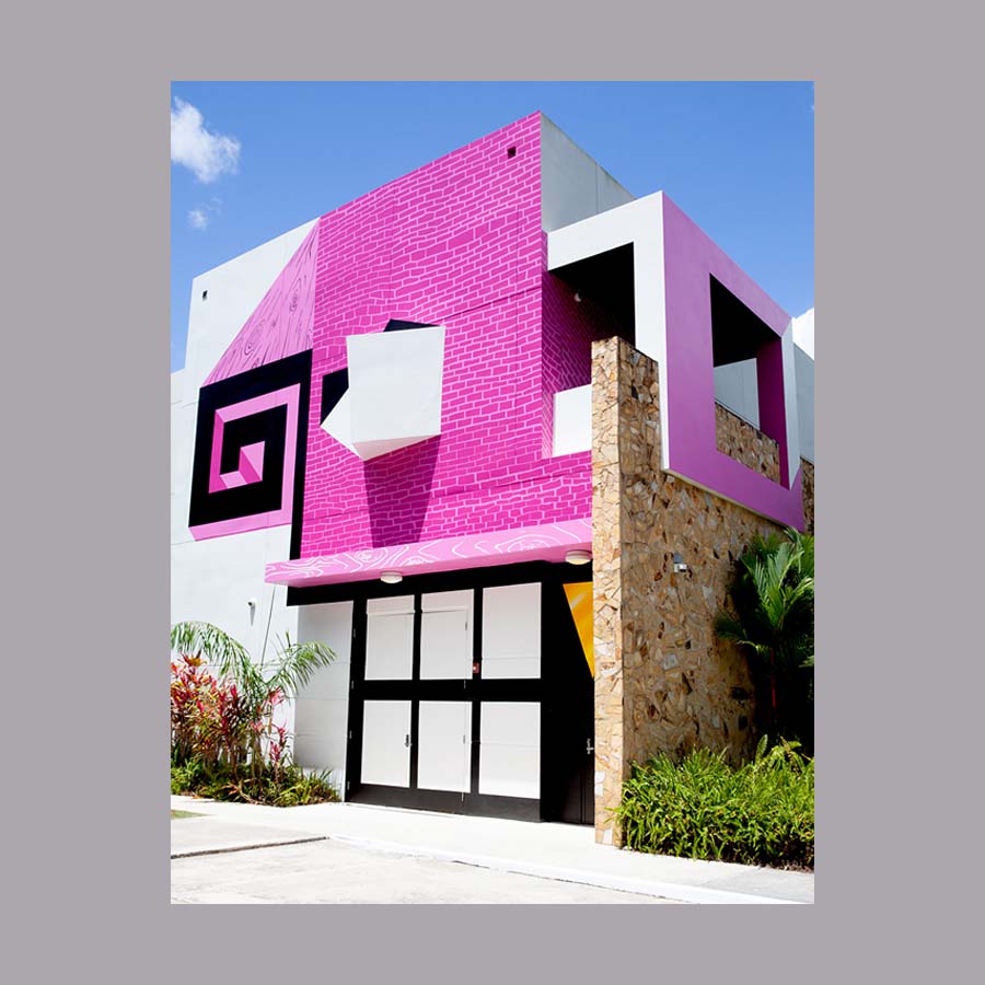 Máscara MCEH (vista lateral). 2022. Pintura al agua para exterior y sellador acrílico sobre muros y puertas de la fachada sur del MCEH, medidas variables.