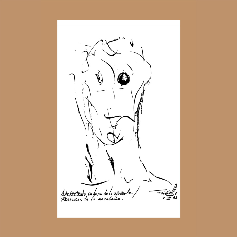 Autorretrato en busca de lo aparente, presencia de lo inacabado. 8/7/1985. <br>Tinta sobre papel. 16.92" x 11.02" (43 x 28 cm)